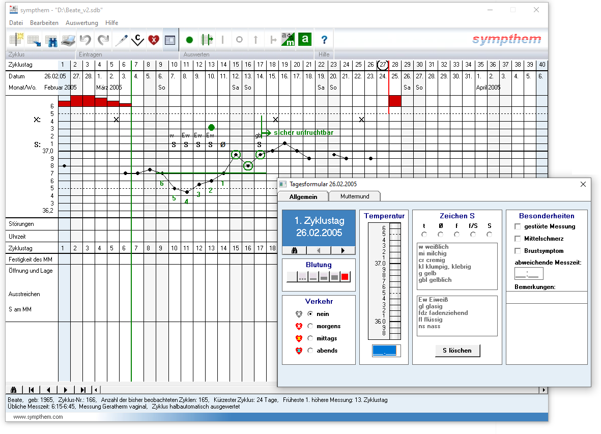 Das Programm ist intuitiv und leicht zu verwenden. Fundierte PC Kenntnisse sind für die Anwendung nicht erforderlich. Anwender können die Methode allein durch das Lesen der Hilfe Schritt für Schritt lernen. Das Programm unterstützt sie bei der Auswertung der Zyklusdaten, die in einer Datenbank gespeichert werden. Sympthem ist kein "Ampel Programm", das vollkommen automatisch unfruchtbare und fruchtbare Tage im Zyklus einer Frau bestimmt. Während der Auswertung des Zyklus ist die Mitarbeit der Anwender notwendig.
