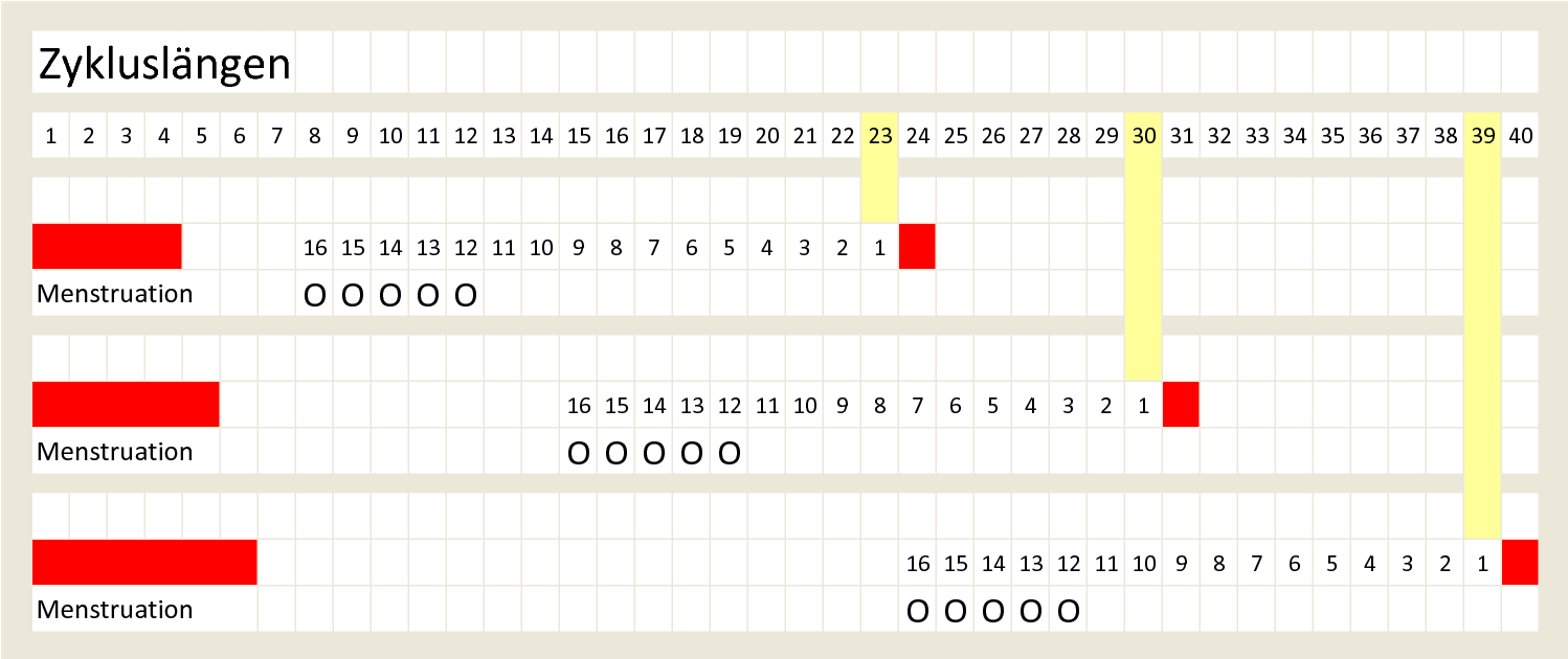 In folgendem Schaubild sind die möglichen Eisprungtage in drei Zyklen unterschiedlicher Länge mit Kreissymbolen gekennzeichnet.